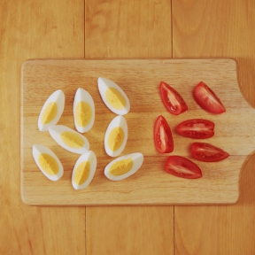 ①ゆで卵は4等分、ミディトマトは4~6等分に切る。グリーンリーフは食べやすい大きさにちぎる。